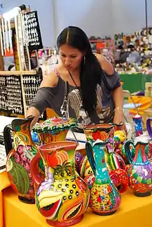 Tonalá has long been recognized as a center for ceramics in Mexico. The streets are filled with artisan workshops and sidewalks stalls selling pottery and stoneware pieces.[45] One thing that distinguishes Tonalá made ware is the decorative details. Two elements, the nahual and the "flor de Tonalá" are common. A nahual is a pre-Hispanic shape shifter or shaman, often drawn as a smiling cat. The flor de Tonalá (Tonalá flower) first appeared in pottery design in the early 20th century. Its distinctive shape is an oval center with rounded petals that form a scalloped design. These elements can appear in all of the types of pottery that is produced here.[45] Market days, Thursday and Sunday, are a good chance to see a wide variety of ceramics of the region, all spread out on the streets of the downtown. While there are a wide variety of figures, utensils and decorative items, it is not all that is produced. Many Many manufacturers sell their wares through other channels. To find the best pieces, one needs to visit the workshops and factories.[44]