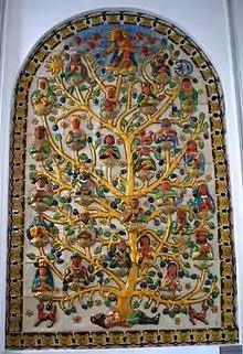 A "tree of life" (arbol de la vida) is a theme of clay sculpture created in central Mexico. The image depicted in these sculptures originally was for the teaching of the Biblical story of creation to natives in the early colonial period. The fashioning of the trees in a clay sculpture began in Izúcar de Matamoros, Puebla but today the craft is most closely identified with Metepec.[71] Traditionally, these sculptures are supposed to consist of certain biblical images, such as Adam and Eve, but other themes such as Christmas, Day of the Dead and even themes unrelated to religion are made.[70][72] Trees of life can be small or as tall as a person. The figures on the Trees of Life are made by molding and attached to the main tree figure with wires before firing. Most are painted in bright colors but there are versions painted entirely in white with gold touches and others left in their natural reddish clay color.[73]