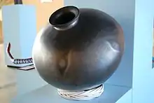 The two best known pottery traditions are "barro negro" and the green-glazed pieces of Santa María Atzompa.[34] Barro negro (black clay) pottery is a style of pottery distinguished by its color, sheen and unique designs, and is most often associated with the town of San Bartolo Coyotepec.[35] The origins of this pottery style extends as far back as the Monte Albán period and for almost all of its history, had been available only in a matte grayish black finish. In the 1950s, a potter named Doña Rosa devised a way to put a black metallic like sheen onto the pottery by polishing it. This look has made the pottery far more popular.[36][37] While the Doña Rosa's techniques and designs are now widely copied in Oaxaca, the original workshop still exists, with her son Valente Nieto Real still making pieces at seventy years of age.[19] From the 1980s to the present, an artisan named Carlomagno Pedro Martinez has promoted items made this way with barro negro sculptures, which have been exhibited in a number of countries.[38]