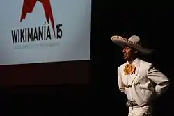 The Jarabe is considered Mexico's “national dance” and is the best known outside the country, often called the “Mexican Hat Dance” in English.[24][25] The dance was performed for the first time formally in 1860 at the Coliseo Theater in Mexico City. During the 1860s it was fashionable in high society.[25] The dance symbolizes the courtship of a woman by a man, who at first is refused but accepted in the end. The two protagonists are usually a man in a charro suit and a woman in a “China Poblana” outfit. It was popularized internationally in the 20th century by Russian dancer Anna Pavlova who visited Mexico in 1919. She made the dance part of her permanent repertoire. The dance's current form emerged nationally during the Mexican Revolution although various “jarabe” dances existed before this time, such as the Jarabe Jalisco, the Jarabe Atole and Jarabe Moreliana. The charros outfit is from Mexico's cowboy tradition and the China Poblana outfit is based on the dress of an Asian woman who became famous in the city of Puebla in the colonial period. Today, this dress, especially the skirt, is heavily decorated with patriotic themes. The Jarabe is danced to Mariachi music and is performed at Mexican national holidays such as Las Fiestas Patrias, Cinco de Mayo, and El Dieciséis de Septiembre.[2]