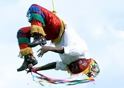 Danza de los Voladores, Dance of the Flyers, is a dance/ceremony/ritual still performed in Mexico today, best known in the Totonicapán area of northern Veracruz and northern Puebla states. It is believed to have originated with the Nahua, Huastec and Otomi peoples in central Mexico, and then spread throughout most of Mesoamerica. The ritual consists of dance and the climbing of a 30-meter pole from which four of the five participants then launch themselves tied with ropes to descend to the ground. The fifth remains on top of the pole, dancing and playing a flute and drum.[22] The ceremony was named an Intangible Cultural Heritage by UNESCO in order to help the ritual survive in the modern world.[23] Veracruz region has influenced their folkloric dance by instilling the musical instruments that originated from the region into the performances like cunjunto jaracho (jarocho ensemble), requito (a guitar-like instrument), pandero (tambourine), and quijada (jawbone of donkey for percussion). As well as having the choreography be influenced by Veracruz animals in the region imitating the moves of iguanas. The costumes reflect the environment of Veracruz illustrated by the performers wearing lacy skirts and blouse to represent the state's humid tropical weather.[3]