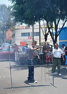 Most artisans are trained by their elders with no formal training or formal degrees in chemistry or engineering, although some have abroad for training as well to promote products.[5][8] Artisans buy ingredients in local chemical supply shops and local markets, which are then mixed by hand in family owned workshops and small factories. Everything is made from scratch, with cartridges made of packing tape and scrap paper purchased in bulk. Often, the fireworks are packaged in nothing but old cornmeal and dog food bags.[9] Most artisans are not formal employees, but rather work in the family business. The formulas used by each workshop are individual and guarded by the families that own them.[8] Workshops are ranked with the best artisans receiving the “maestro” (master) title, able to produce elaborate products such as castillos, bombas, toritos and synchronized fireworks/light/music shows.[8]