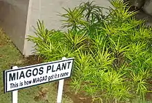 The name of Miagao has many disputed etymologies. One of the most popular, and probably the most widely accepted version is that the name of the town was derived from a plant named Miagos. Miagos or Osmoxylon lineare is a flowering plant from the family Araliaceae that used to grow abundantly in the area when the Spaniards came. Because of its abundance in the area, the Spaniards named the place Miagos which later became Miagao. Another version, according to Rev. Fr. Lorenzo Torres of Igbaras, is that a native named "Miyagaw" was asked by the Spaniards for the name of the place but gave his name instead.[7]