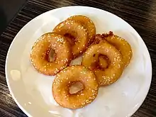 Mianwo is a deep-fried, donut-shaped snack from Wuhan in Hubei province in central China. It is made from soy milk, rice milk, flour, sesame, and chopped Chinese scallion. Mianwo usually has a salty taste, but a sweeter variant may be made with diced sweet potato.