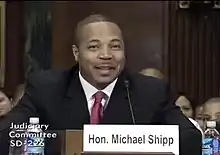 On January 23, 2012, President Barack Obama nominated Shipp to be a United States District Judge for the United States District Court for the District of New Jersey to the seat vacated by Judge Mary Little Cooper, who assumed senior status in 2011. He received a hearing before the Senate Judiciary Committee on March 14, 2012 and his nomination was reported to the floor on April 19, 2012, by a voice vote, with Senator Lee recorded as voting no based on unrelated general principles.[2] Despite the relatively uncontroversial nature of Shipp's nomination, Senator Rand Paul in July 2012 held up allowing an up-or-down, Senate floor vote on Shipp's nomination over an unrelated issue, involving Paul's desire to cut off all U.S. aid to Pakistan unless authorities there release Dr. Shakil Afridi.[5] In a Senate floor speech on July 19, 2012, Paul announced his intention to hold up all Senate business until receiving a satisfactory answer to his question about why a Pakistani judicial panel has delayed Afridi's appeal of his conviction on charges related to assistance he provided to the CIA in the capture of Osama bin Laden. Paul also said he intended to seek a vote to terminate all aid to Pakistan.[5] On July 19, 2012, Senate Majority Leader Harry Reid moved to invoke cloture in order to confirm Shipp's nomination. The cloture vote was vitiated on July 23, 2012 when Paul consented to a confirmation vote on the nomination. Shipp's nomination was confirmed that same day by a 91–1 vote, with Senator Mike Lee again casting the sole no vote.[6][7] He received his commission on July 26, 2012.[3]