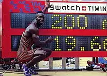 Michael Duane Johnson (born September 13, 1967) is an American retired sprinter who won four Olympic gold medals and eight World Championships gold medals in the span of his career.[2] He formerly held the world and Olympic records in the 200 m and 400 m, as well as the world record in the indoor 400 m. He also once held the world's best time in the 300 m. Johnson is generally considered one of the greatest and most consistent sprinters in the history of track and field.[3][4]