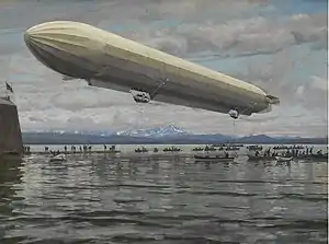Another panorama from 1896 depicted the Battle of Bazeilles from the Franco-Prussian War. It was displayed at a specially constructed building in Mannheim and is now lost. He created several works for the Deutsches Museum in Munich; including a Roman aqueduct for the hydraulic engineering display, a Medieval herb garden and the flight of a zeppelin (1909). In Stuttgart, for the "Ketterer", a restaurant at a brewery, he produced a series of fourteen large paintings on the history of Swabian emigration.