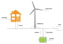 Community microgrids can serve thousands of customers and support the penetration of local energy (electricity, heating, and cooling).[13] In a community microgrid, some houses may have some renewable sources that can supply their demand as well as that of their neighbors within the same community. The community microgrid may also have a centralized or several distributed energy storages. Such microgrids can be in the form of an ac and dc microgrid coupled together through a bi-directional power electronic converter.[14]