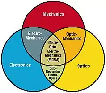 In 1993, Dr. Motamedi officially introduced MOEMS for the first time, as the powerful combination of MEMS and micro-optics, in an invited talk at the SPIE Critical Reviews of Optical Science and Technology conference in San Diego. In this talk Dr. Motamedi introduced the figure below, for showing that MOEMS is the interaction of three major microtechnologies; namely micro-optics, micromechanics, and microelectronics.[1]