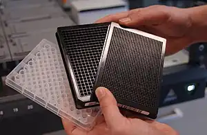 A microplate, also known as a microtiter plate (Microtiter is a registered trademark in the United States, therefore it should not be used generically without attribution), microwell plate or multiwell,[1] is a flat plate with multiple "wells" used as small test tubes. The microplate has become a standard tool in analytical research and clinical diagnostic testing laboratories. A very common usage is in the enzyme-linked immunosorbent assay (ELISA), the basis of most modern medical diagnostic testing in humans and animals.