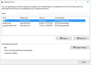 Microsoft Drive Optimizer (formerly Disk Defragmenter) is a utility in Microsoft Windows designed to increase data access speed by rearranging files stored on a disk to occupy contiguous storage locations, a technique called defragmentation. Defragmenting a disk minimizes head travel, which reduces the time it takes to read files from and write files to the disk.[1] As a result of the decreased read and write times, Microsoft Drive Optimizer decreases system startup times for systems starting from magnetic storage devices such as a hard drive. However, defragmentation is not helpful on storage devices such as solid state drives, USB drives or SD cards that use flash memory to increase speeds, as these drives do not use a head. Defragmentation may decrease lifespan for certain technologies, e.g. solid state drives. Microsoft Drive Optimizer was first officially shipped with Windows XP.