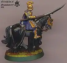 Four of the game's designers were in the extended Return of the King film as Rohirrim at the Battle of the Pelennor Fields: Alessio Cavatore, Brian Nelson, and Alan and Michael Perry.[8] They can be seen near the Oliphaunt when Peregrin Took goes searching for Meriadoc Brandybuck among the debris from the battle, and are also on the base of Games Workshop's Mûmak miniature.[9] Games Workshop created two miniatures of Peter Jackson, based on his appearance as a Breeland man during the Fellowship of the Ring:[10] one is owned by the director, and the other is kept on display at Warhammer World in England.[11] Games Workshop has also released a model of Peter Jackson as one of the Corsairs of Umbar from The Return of the King.