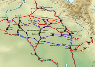![]() Approximate map of the Middle Assyrian Empire at its height in the 13th century BC | |||||||||||