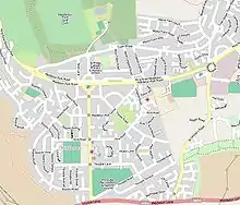On Town Street, a row of brick-built cottages with stone slate roofs, known as Top of the town was built in the mid 18th century.[61] The 19th-century St Mary's Church,[62] with its contemporary lych gate and flanking walls are all Grade II listed buildings.[63] In the churchyard is a war memorial erected in 1920.[64] To the west of the war memorial is a gatehouse which stood at an old entrance to the hall grounds.[65][66] The distinctive white concrete water tower at the high point of the hill is at the south west corner of the park on Town Street.