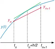 In numerical analysis, a branch of applied mathematics, the midpoint method is a one-step method for numerically solving the differential equation,