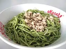 Mie ayam, mi ayam, or bakmi ayam (Indonesian for 'chicken bakmi', literally chicken noodles) is a common Indonesian dish of seasoned yellow wheat noodles topped with diced chicken meat (ayam).[3][4] It is derived from culinary techniques employed in Chinese cuisine.[5][6] In Indonesia, the dish is recognized as a popular Chinese Indonesian dish,[5] served from simple travelling vendor carts frequenting residential areas, humble street-side warung to restaurants.