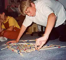 - the person to the left of the player turn rebundles and drops the sticks for the player, thus eliminating the potential for a doctored drop.