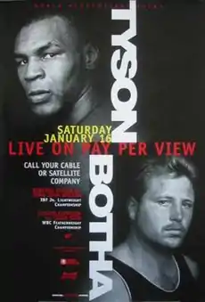 After Tyson's controversial fight with Evander Holyfield on June 28, 1997 which saw Tyson get disqualified in the third round after twice biting Holyfield's ears, the Nevada Athletic Commission fined Tyson $3 million and revoked his boxing license.[1] Tyson's ban would ultimately last a total of 15 months and 10 days with it finally ending after a five-man committee voted in favor of reinstating Tyson by a vote of 4–1 on October 18, 1998.[2] After much speculation over who Tyson would face in his return bout, it was officially announced that Tyson would face former IBF Heavyweight champion Francois Botha on January 16, 1999.[3] Despite his long layoff, Tyson was forthright about his chances of collecting a victory over Botha by way of knockout. On one occasion, Tyson stated "I am going right at him and I expect him to go down cold. I expect him to die." The comment would cause some controversy, with some in the boxing world claiming that Tyson had gone too far.[4] Botha also was confident that he could defeat Tyson, claiming that he would earn the victory by way of "seventh round knockout".[5]