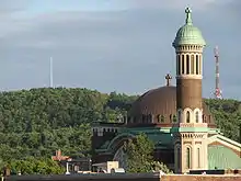 Perhaps the most recognizable architectural symbol of Mile End is the Church of St. Michael the Archangel[23][24] of 1914-5, on Saint-Viateur Street at the corner of Saint-Urbain. The church, designed by Aristide Beaugrand-Champagne, was built for an Irish Catholic community, as expressed by omnipresent shamrock motifs; yet the overall style of the building is based on Byzantine rather than Western architectural traditions. Even more striking, the church has a slender tower that resembles a minaret. The building has been shared since 1964 with the Polish Catholic mission of St. Anthony of Padua, which officially merged with the parish of St. Michael in 1969 to form the current parish of St. Michael's and St. Anthony's;[25] masses are celebrated in Polish and in English.