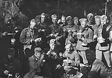 By World War II, rations had taken modern organized forms for both the Allies and the Axis. The U.S. military revised their World War I-era ration organization system into an alphabetized system: A-rations of fresh food, B-rations of packaged unprepared food, C-rations of prepared canned food, D-rations of chocolate, and K-rations of three-course meals.[26] British soldiers were issued 24-hour rations intended to sustain troops until composite rations and fresh food could be supplied by field kitchens.[17] On the home front in Britain, mobile canteens were operated to feed Home Guard and civil defence authorities hot food and fresh tea.[27] Red Army soldiers received rye bread, potatoes, vegetables, pasta, meat, and fish (in order of quantity).[28][29] The Chinese Second United Front had ample food supplies, but food was strained after 1940, when food panics and requirements for peasants to feed Chinese soldiers led to agricultural failures and severe inflation.[30] The German Wehrmacht received basic rations of hard bread and canned meat (usually pork, roast beef, turkey, or chicken, though Fleischkonserve—literally translated as "can of meat"—went unidentified), though canned tomato soup, condensed milk, and Erbswurst (a compact peasemeal sausage that can be dissolved to make pea soup) were also common. Elite units such as the Fallschirmjäger received more unique high-energy food, including tins of cheese and sausage. The Schutzstaffel received four-day rations consisting of Graubrot, canned meat, vegetables, spreads, coffee, and cigarettes (despite the SS's strong anti-smoking stance). Regions invaded and occupied by Nazi forces were stripped of their food to feed Germans and starve local populations.[31] The Imperial Japanese Army and Navy received rather basic rations that were intended to be eaten alongside other foraged food.[30] The Royal Italian Army ate mainly pasta, bread, oatmeal, meat, fish, broth, and salad from their field kitchens, with alcohol also regularly issued. However, on deployment, Italian soldiers mostly received low-quality canned food and biscuits, with regular supplies of food strained by logistical issues during the North African campaign.[32]