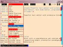 Mined is a modeless editor, with menus and mouse support, and key bindings optimized for intuitive and fast navigation (optionally using control key bindings or various editors).