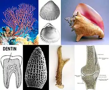 Mineralized tissues are biological tissues that incorporate minerals into soft matrices. Typically these tissues form a protective shield or structural support.[1] Bone, mollusc shells, deep sea sponge Euplectella species, radiolarians, diatoms, antler bone, tendon, cartilage, tooth enamel and dentin are some examples of mineralized tissues.[1][2][3][4]