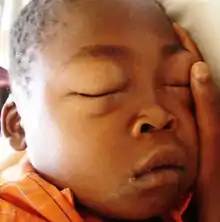 The first clinical sign of minimal change disease is usually edema with an associated increase in weight.[1] The swelling may be mild but patients can present with edema in the lower half of the body, periorbital edema, swelling in the scrotal/labial area and anasarca in more severe cases.[1] In older adults, patients may also present with acute kidney injury (20–25% of affected adults) and high blood pressure.[4] Due to the disease process, patients with minimal change disease are also at risk of blood clots and infections.[4]
