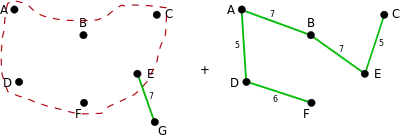 The algorithm half divides edges in two sets with respect to weights. Green edges are those edges whose weights are as small as possible. |