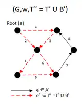 For a directed graph, Camerini's algorithm focuses on finding the set of edges that would have its maximum cost as the bottleneck cost of the MBSA. This is done by partitioning the set of edges E into two sets A and B and maintaining the set T that is the set in which it is known that GT does not have a spanning arborescence, increasing T by B whenever the maximal arborescence of G(B ∪ T) is not a spanning arborescence of G, otherwise we decrease E by A. The total time complexity is O(E log E).[5][4]