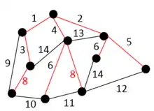 In mathematics, a minimum bottleneck spanning tree (MBST) in an undirected graph is a spanning tree in which the most expensive edge is as cheap as possible. A bottleneck edge is the highest weighted edge in a spanning tree. A spanning tree is a minimum bottleneck spanning tree if the graph does not contain a spanning tree with a smaller bottleneck edge weight.[1] For a directed graph, a similar problem is known as Minimum Bottleneck Spanning Arborescence (MBSA).