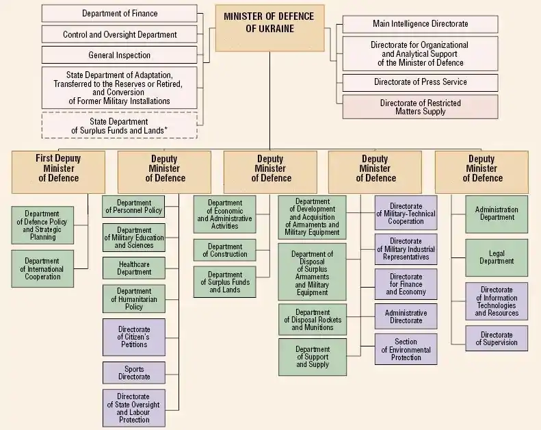The ministry was established in Ukraine on 24 September 1991,[4][5] one month after Ukraine's declaration of independence resolution. The ministry was put in charge of all Soviet military forces reorganization on the territory of Ukrainian jurisdiction.[4][6] In 1994, Ukraine voluntarily gave up all nuclear weapons. The ministry spent significant funds eliminating nuclear weapons, military bases and equipment to meet Treaty on Conventional Armed Forces in Europe requirements.