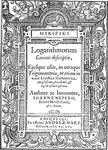 Mirifici Logarithmorum Canonis Descriptio (Description of the Wonderful Canon of Logarithms, 1614) and Mirifici Logarithmorum Canonis Constructio (Construction of the Wonderful Canon of Logarithms, 1619) are two books in Latin by John Napier expounding the method of logarithms. While others had approached the idea of logarithms, notably Jost Bürgi, it was Napier who first published the concept, along with easily used precomputed tables, in his Mirifici Logarithmorum Canonis Descriptio.[1][2][3]