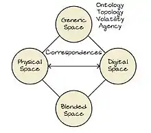 For presence in a blended space, there must be a physical space and a digital space. In the context of blended space, the higher the communication between the physical and digital spaces, the richer the experience.[30] This communication happens through the medium of correspondents which relay the state and nature of objects.