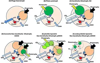 - Non-constitutive mixotrophs (NCMs): phagotrophic organisms that must ingest prey to attain the ability to photosynthesize. NCMs are further broken down into: