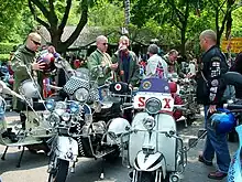 After the seaside resort brawls, the media began to associate Italian scooters with violent mods. Much later, writers described groups of mods riding scooters together as a "menacing symbol of group solidarity" that was "converted into a weapon".[71][72] With events like the 6 November 1966, "scooter charge" on Buckingham Palace, the scooter, along with the mods' short hair and suits, began to be seen as a symbol of subversion.[73]