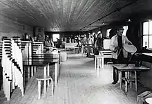In the early 1930s Aalto undertook a series of experiments in the bending of wood, which ultimately culminated with his development of a bent wooden chair leg that could be manufactured en masse and did not require joinery.[1][2] Aalto used the chair leg, named the "L leg" in his 1933 design for the model 60 stool, which was intended for use in the Vyborg Library.[3] Aalto notoriously tested the durability of his design by repeatedly throwing a prototype of the stool against the ground.[4]
