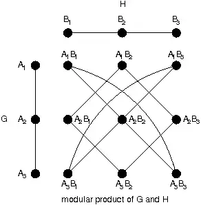 The vertex set of the modular product of G and H is the cartesian product V(G) × V(H). Any two vertices (u, v) and (u' , v' ) are adjacent in the modular product of G and H if and only if u is distinct from u', v is distinct from v', and either