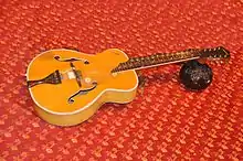 Vishwa Mohan Bhatt's instrument, a modified archtop Hawaiian guitar with eight total melody and drone strings strung from the peghead, and twelve sympathetic strings strung to the tuners mounted on the side of the neck
