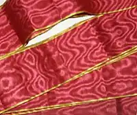 Moire (/ˈmwɑːr/ or /ˈmɔːr/), less often moiré, is a textile with a wavy (watered) appearance produced mainly from silk, but also wool, cotton and rayon. The watered appearance is usually created by the finishing technique called calendering. Moire effects are also achieved by certain weaves,[1] such as varying the tension in the warp and weft of the weave. Silk treated in this way is sometimes called watered silk.[2]