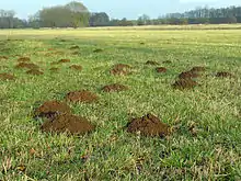 Moles burrow and raise molehills, killing parts of lawns. They can undermine plant roots, indirectly causing damage or death. Moles do not eat plant roots.[21]