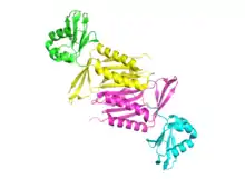 Molybdopterin synthase is heterodimeric and coded for by the MOCS2 gene.[3] Genetic deficiencies of enzymes such as MPT synthase, which are involved in MoCo biosynthesis, lead to MoCo deficiency, a rare disease that results in severe neurological abnormalities.[4][5][6][7]