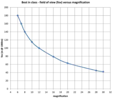 Field of view (FOV) and magnification are related; FOV increases with decreasing magnification and vice versa. This applies to monoculars, binoculars, and telescopes. However, this relationship also depends on optical design and manufacture, which can cause some variation. The following chart shows the FOV/magnification relationship based on best-in-class data, taken both from tests and manufacturers' specifications. Contrary to some belief, it is a myth that binoculars offer a wider field of view than monoculars. For a given specification and manufacturer offering, both monocular or binocular options of the same model, the field of view is exactly the same, whether monocular or binocular.