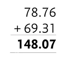 Many fonts that generally are not monospaced have numerals that are known as tabular figures.[5][6] As tabular spacing makes all numbers with the same number of digits the same width, it is used for typesetting documents such as price lists, stock listings and sums in mathematics textbooks, all of which require columns of numbers to line up on top of each other for easier comparison.[7] Tabular spacing is also a common feature of simple printing devices such as cash registers and date-stamps.[8] Fonts intended for professional use in documents such as business reports may also make the bold numbers take up the same width as the numbers in regular style; the consistency between styles is called "duplexing".[9]