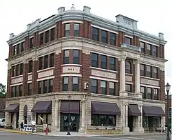 The building was constructed of rusticated stone blocks with the upper floors built with red brick on a primarily square footprint. The four-story building contains three entrances on the ground floor, two on the main facades and the third on a flattened corner. The entrances on the south facade are surrounded by Ionic columns, the entrance on the corner has a panel above the second floor windows reading "1903", with decorative scrollwork stone panels separating the second and third floors. Above the entrance on the south facade rises two large Corinthian columns with balconies and a balustrade panel bearing "1903" on the panel. This piece is part of what was once a complete balustrade running along the roofline.