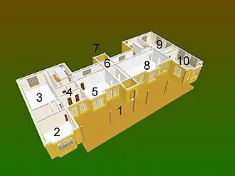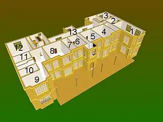 Key: 1: Long Gallery, 2: Blew Chamber in 1635, now an exhibition room, 3: Wainscott Chamber in 1635, now an exhibition room, 4: Former bedroom, not open to the public, 5: Primrose Chamber in 1635, now an exhibition room, 6: White Chamber in 1635, now an exhibition room.