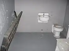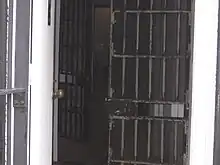 In 1896, Conley deemed the old Territorial Penitentiary insufficient, even after remodeling it to house 164 inmates, so he constructed the first of two cellblocks. The 1896 Cellblock bordered the Territorial building on its southern side and could house 256 inmates in four tiers of thirty-two cells, each measuring 6 ft (1.8 m) long, 8 ft (2.4 m) deep, and 7 ft 4 in (2.24 m) tall.[19] None of these cells had plumbing, however, and inmates again used the bucket system: one for fresh water, the other for human waste.[20] Each door locked individually, which, when combined with the wood stoves which heated the building and the wooden roof, created a safety hazard in the case of a fire. Electricity didn't enter the building until after the start of the 20th century, but this building was a marked improvement from the antiquated Territorial building.