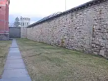 Conley waited for a few years before starting one of his biggest projects—the prison walls. In 1893, he put his prisoners to work to construct the 20 to 22 ft (6.7 m) high walls which extended underground for four feet and were 3½ ft. thick underground and tapered to two feet thick at the top. The wall was constructed of locally quarried sandstone mined, shaped, mortared, and placed by prison labor. The walls had six towers, a sally port to admit vehicles, and a smaller portal to admit people. The imposing structure with its crenellated towers dominates the southern end of Main Street Deer Lodge and resembles a medieval castle.[18][19]