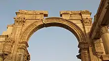 The Monumental Arch, also called the Arch of Triumph (Arabic: قوس النصر) or the Arch of Septimius Severus, was a Roman ornamental archway in Palmyra, Syria. It was built in the 3rd century during the reign of emperor Septimius Severus. Its ruins later became one of the main attractions of Palmyra until it was officially destroyed by the ISIS in 2015. Most of its stonework still survives and there are plans to rebuild it using anastylosis.