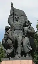 Monument to the Fighters of the October Revolution (originally on Pushkin Street, the intersection with Raimbek Avenue, now in a park near the Sary-Arka movie theater) | Installed in 1967 to the 50th anniversary of the Revolution. Sculptor - N.S. Zhuravlev, architects - I.I. Tokar, B.P. Voronin. The height is 5,9 meters. The monument is in the form of multifigured sculptural group, depicting fighters for Soviet power in Semirechye. The composition includes a plaque with the inscription: "Your eternal feat will live forever in the hearts of grateful descendants". The pedestal is faced with red granite.[19] It was dismantled in the summer of 2012 and moved to the square behind the "Sary-Arka" cinema. |
