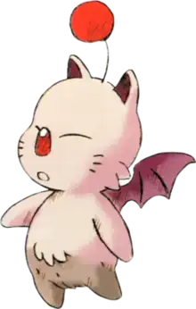 Moogles (モーグリ, mōguri) are a fictional species of diminutive, sentient creatures and a recurring element of the Final Fantasy video game franchise, starting with their initial appearance in Final Fantasy III. They also appear in the Mana and Kingdom Hearts series.[1] Moogles serve a variety of purposes in the various games in which they appear. They sometimes provide opportunities to record game progress or access shops; occasionally they assist in battle or may even become a playable character.